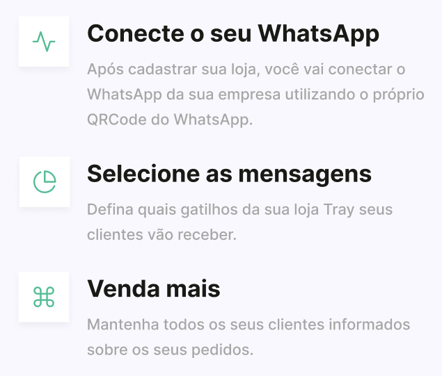 As mensagens são enviadas diretamente do número de WhatsApp da sua empresa. É só ler o QRCode do WhatsApp, marcar quais mensagens serão enviadas e pronto! Agora seu e-commerce vai enviar os gatilhos da Tray 100% de forma automática e você vai poder acompanhar tudo bem de perto.